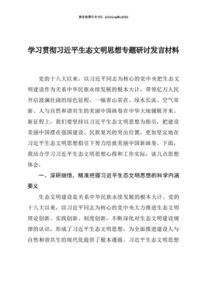 / 【七哥公文】2024年:学习贯彻习近平生态文明思想专题研讨发言材料+更多免费公文+VX:QiGeGongWen2024