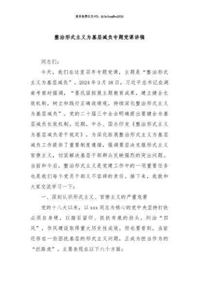 / 【七哥公文】2024年:整治形式主义为基层减负专题党课讲稿+更多免费公文+VX:QiGeGongWen2024