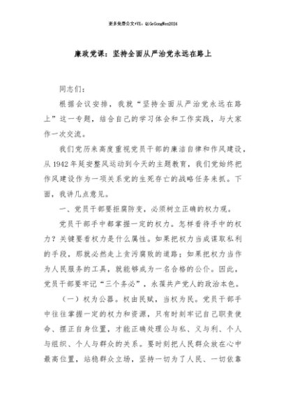 / 【七哥公文】2024年:廉政党课:坚持全面从严治党永远在路上+更多免费公文+VX:QiGeGongWen2024