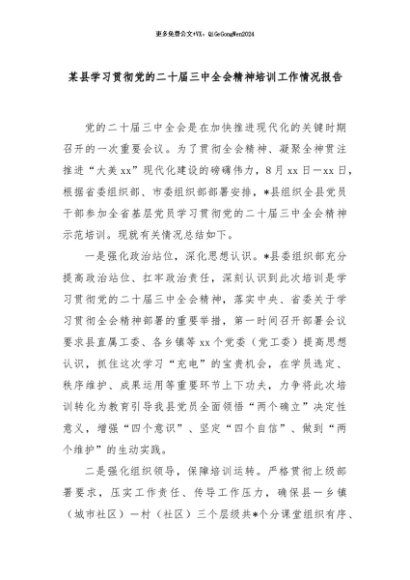 【七哥公文】2024年:某县学习贯彻党的二十届三中全会精神培训工作情况报告+更多免费公文+VX:QiGeGongWen2024