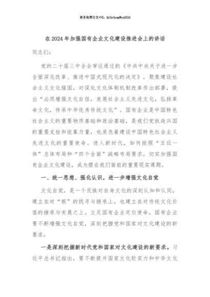 / 【七哥公文】2024年:在2024年加强国有企业文化建设推进会上的讲话+更多免费公文+VX:QiGeGongWen2024