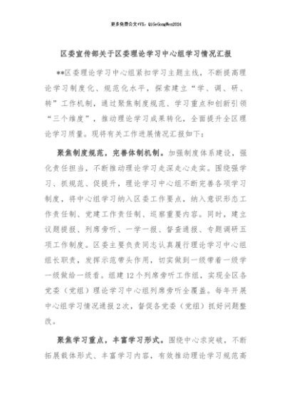 / 【七哥公文】2024年:区委宣传部关于区委理论学习中心组学习情况汇报+更多免费公文+VX:QiGeGongWen2024