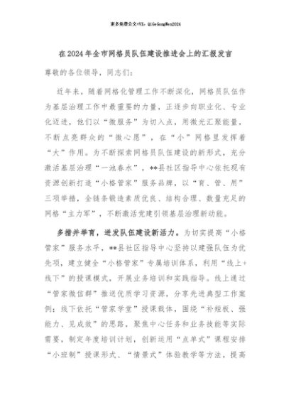 / 【七哥公文】2024年:在2024年全市网格员队伍建设推进会上的汇报发言+更多免费公文+VX:QiGeGongWen2024