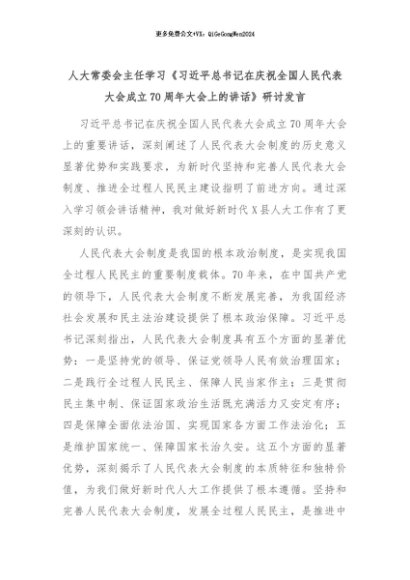 【七哥公文】2024年:人大常委会主任学习《习近平总书记在庆祝全国人民代表大会成立70周年大会上的讲话》研讨发言+更多免费公文+VX:QiGeGongWen2024