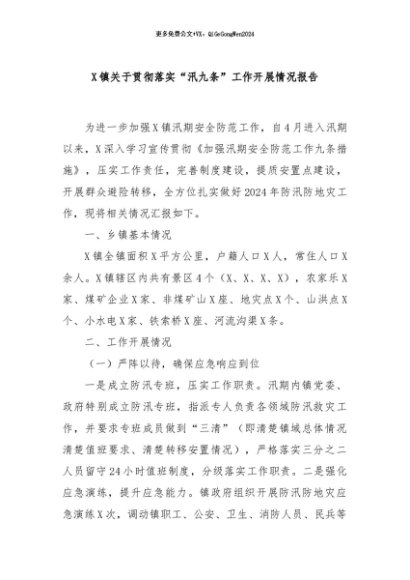 / 【七哥公文】2024年:X镇关于贯彻落实“汛九条”工作开展情况报告+更多免费公文+VX:QiGeGongWen2024