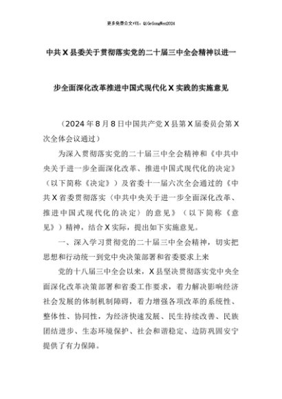 【七哥公文】2024年:中共X县委关于贯彻落实党的二十届三中全会精神以进一步全面深化改革推进中国式现代化X实践的实施意见+更多免费公文+VX:QiGeGongWen2024