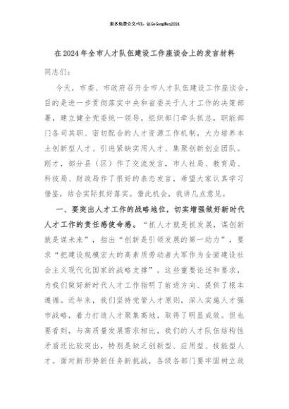 【七哥公文】2024年:在2024年全市人才队伍建设工作座谈会上的发言材料+更多免费公文+VX:QiGeGongWen2024