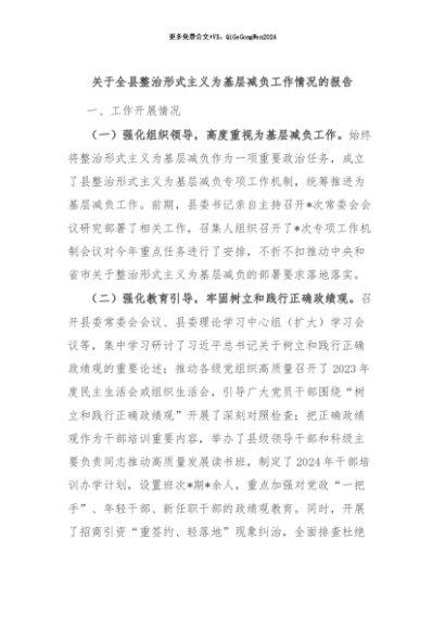 / 【七哥公文】2024年:关于全县整治形式主义为基层减负工作情况的报告+更多免费公文+VX:QiGeGongWen2024