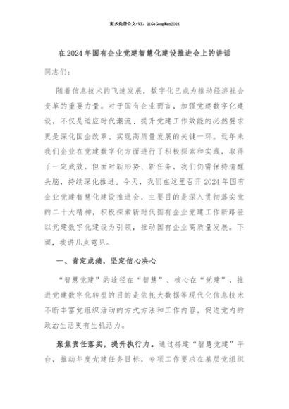/ 【七哥公文】2024年:在2024年国有企业党建智慧化建设推进会上的讲话+更多免费公文+VX:QiGeGongWen2024