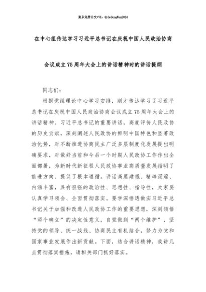 【七哥公文】2024年:在中心组传达学习习近平总书记在庆祝中国人民政治协商会议成立75周年大会上的讲话精神时的讲话提纲+更多免费公文+VX:QiGeGongWen2024