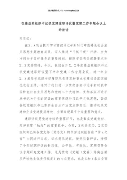 【七哥公文】2024年:在基层党组织书记抓党建述职评议暨党建工作专题会议上的讲话+更多免费公文+VX:QiGeGongWen2024