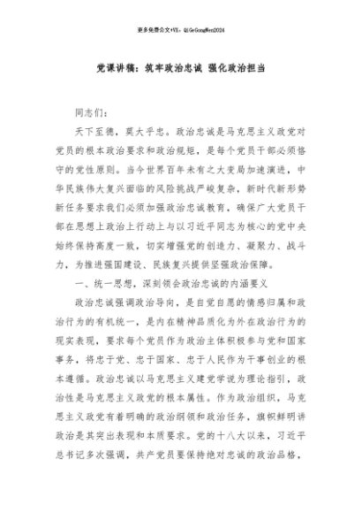 / 【七哥公文】2024年:党课讲稿:筑牢政治忠诚 强化政治担当+更多免费公文+VX:QiGeGongWen2024