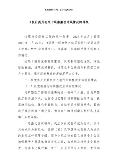 / 【七哥公文】2024年:X报社委员会关于巡察整改进展情况的通报+更多免费公文+VX:QiGeGongWen2024