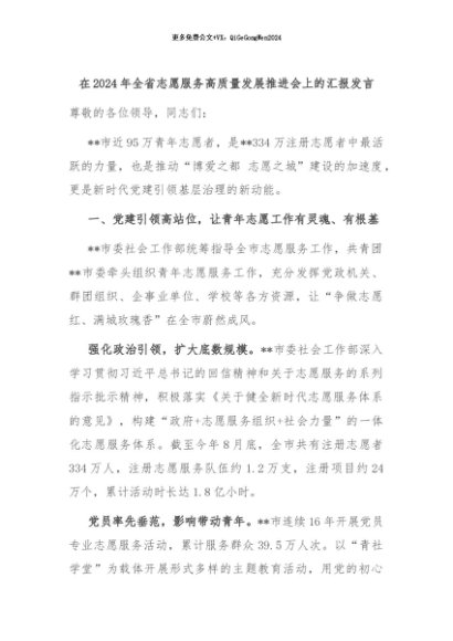 【七哥公文】2024年:在2024年全省志愿服务高质量发展推进会上的汇报发言+更多免费公文+VX:QiGeGongWen2024