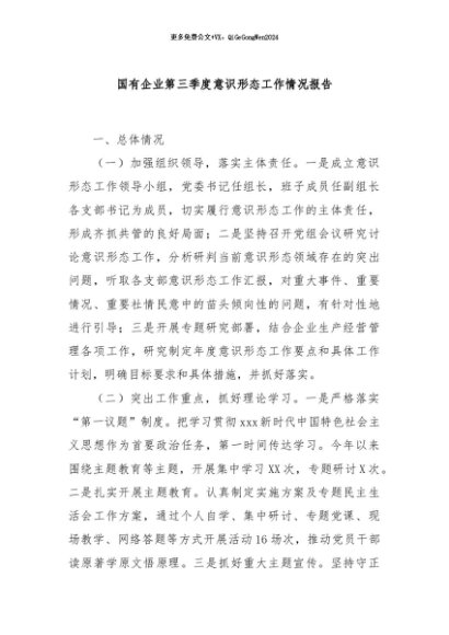 / 【七哥公文】2024年:国有企业第三季度意识形态工作情况报告+更多免费公文+VX:QiGeGongWen2024