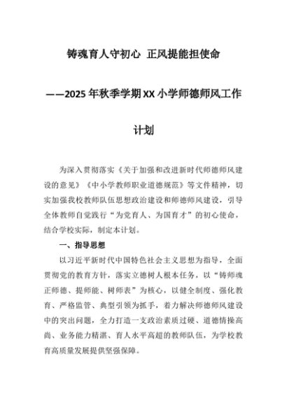 【七哥公文】2025年:2025年秋季学期XX小学师德师风工作计划:铸魂育人守初心 正风提能担使命+更多免费公文+VX:QiGeGongWen2024