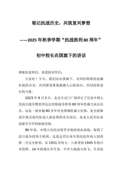 【七哥公文】2025年:2025年秋季学期“抗战胜利80周年”初中校长在国旗下的讲话:铭记抗战历史,共筑复兴梦想+更多免费公文+VX:QiGeGongWen2024