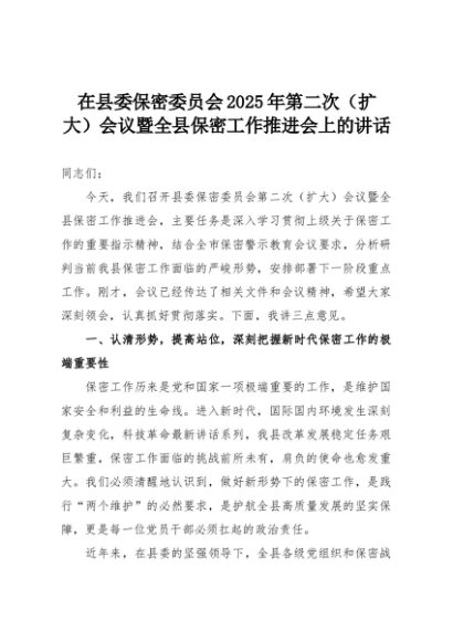 【七哥公文】2025年:在县委保密委员会2025年第二次(扩大)会议暨全县保密工作推进会上的讲话+更多免费公文+VX:QiGeGongWen2024