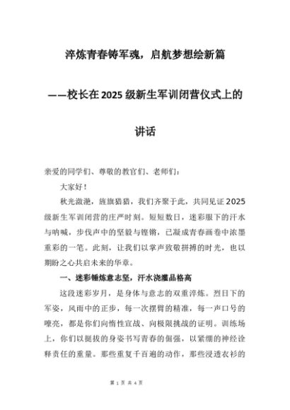 【七哥公文】2025年:校长在2025级新生军训闭营仪式上的讲话:淬炼青春铸军魂,启航梦想绘新篇+更多免费公文+VX:QiGeGongWen2024