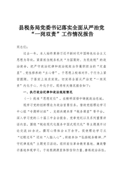 【七哥公文】2025年:县税务局党委书记落实全面从严治党“一岗双责”工作情况报告+更多免费公文+VX:QiGeGongWen2024