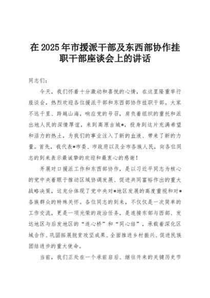【七哥公文】2025年:在2025年市援派干部及东西部协作挂职干部座谈会上的讲话+更多免费公文+VX:QiGeGongWen2024