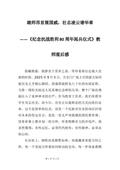 【七哥公文】2025年:《纪念抗战胜利80周年阅兵仪式》教师观后感:雄师昂首展国威,壮志凌云谱华章+更多免费公文+VX:QiGeGongWen2024