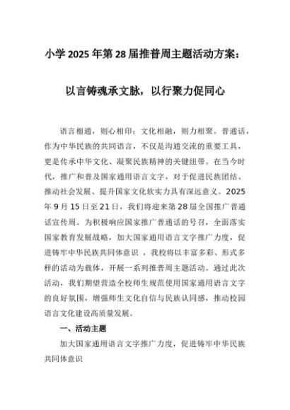 【七哥公文】2025年:小学2025年第28届推普周主题活动方案:以言铸魂承文脉,以行聚力促同心+更多免费公文+VX:QiGeGongWen2024