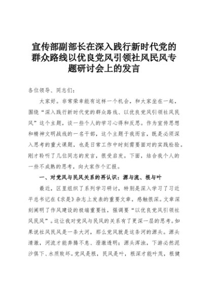 【七哥公文】2025年:宣传部副部长在深入践行新时代党的群众路线以优良党风引领社风民风专题研讨会上的发言+更多免费公文+VX:QiGeGongWen2024