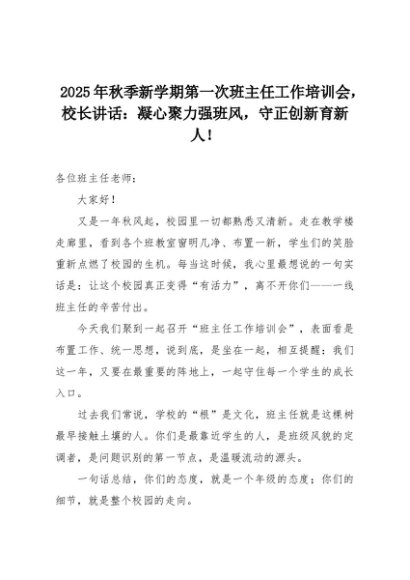【七哥公文】2025年:2025年秋季新学期第一次班主任工作培训会,校长讲话:凝心聚力强班风,守正创新育新人!+更多免费公文+VX:QiGeGongWen2024