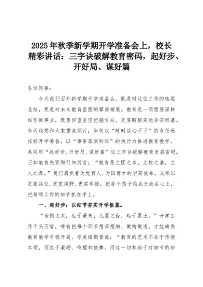 【七哥公文】2025年:2025年秋季新学期开学准备会上,校长精彩讲话:三字诀破解教育密码,起好步、开好局、谋好篇+更多免费公文+VX:QiGeGongWen2024