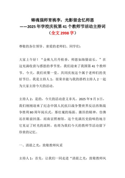 【七哥公文】2025年:铸魂强师育桃李,光影留念忆师恩——2025年学校庆祝第41个教师节活动主持词+更多免费公文+VX:QiGeGongWen2024