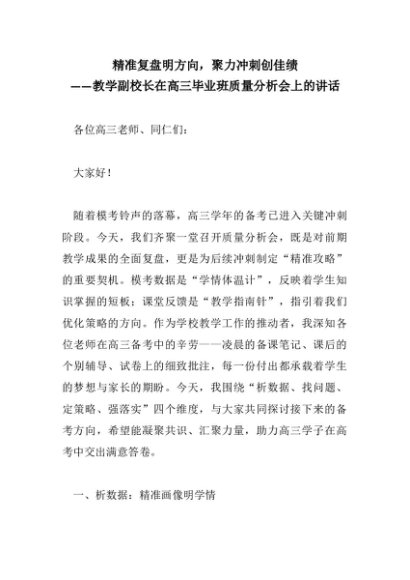 【七哥公文】2025年:精准复盘明方向,聚力冲刺创佳绩 ——教学副校长在高三毕业班质量分析会上的讲话+更多免费公文+VX:QiGeGongWen2024