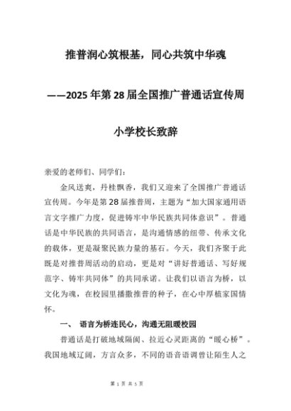 【七哥公文】2025年:2025年第28届全国推广普通话宣传周小学校长致辞:推普润心筑根基,同心共筑中华魂+更多免费公文+VX:QiGeGongWen2024