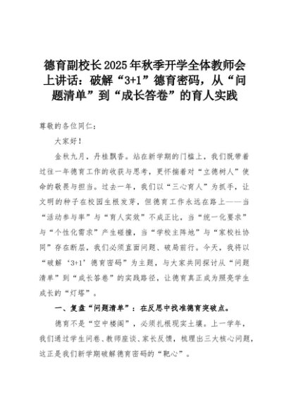【七哥公文】2025年:德育副校长2025年秋季开学全体教师会上讲话:破解“3+1”德育密码,从“问题清单”到“成长答卷”的育人实践+更多免费公文+VX:QiGeGongWen2024