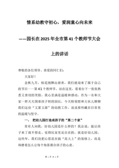 【七哥公文】2025年:园长在2025年全市第41个教师节大会上的讲话:情系幼教守初心,爱润童心向未来+更多免费公文+VX:QiGeGongWen2024