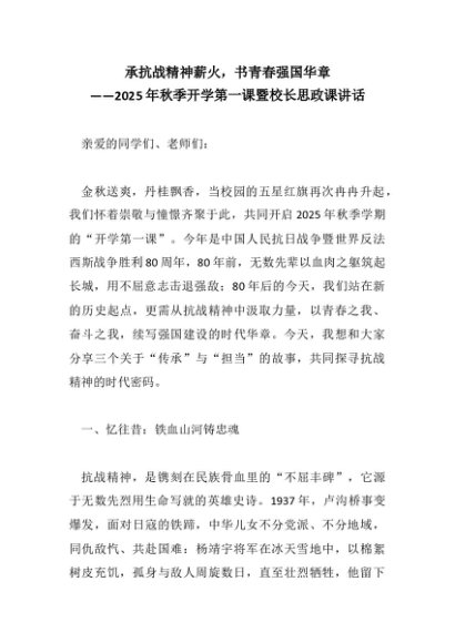 【七哥公文】2025年:承抗战精神薪火,书青春强国华章 ——2025年秋季开学第一课暨校长思政课讲话+更多免费公文+VX:QiGeGongWen2024