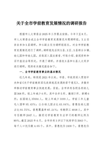 / 【七哥公文】2025年:关于全市学前教育发展情况的调研报告+更多免费公文+VX:QiGeGongWen2024