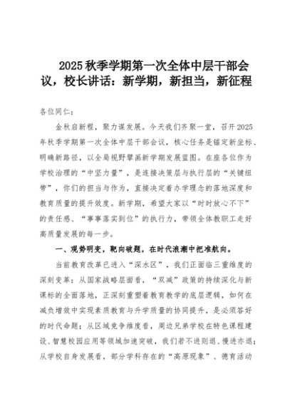 【七哥公文】2025年:2025秋季学期第一次全体中层干部会议,校长讲话:新学期,新担当,新征程+更多免费公文+VX:QiGeGongWen2024