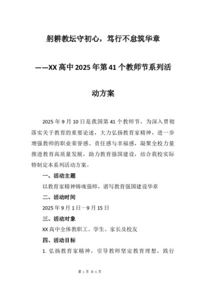 【七哥公文】2025年:XX高中2025年第41个教师节系列活动方案:躬耕教坛守初心,笃行不怠筑华章+更多免费公文+VX:QiGeGongWen2024