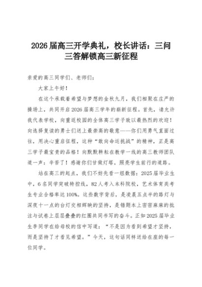 【七哥公文】2025年:2026届高三开学典礼,校长讲话:三问三答解锁高三新征程+更多免费公文+VX:QiGeGongWen2024