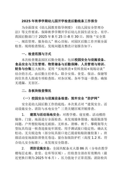 / 【七哥公文】2025年:2025年秋季学期幼儿园开学检查后勤线条工作报告+更多免费公文+VX:QiGeGongWen2024