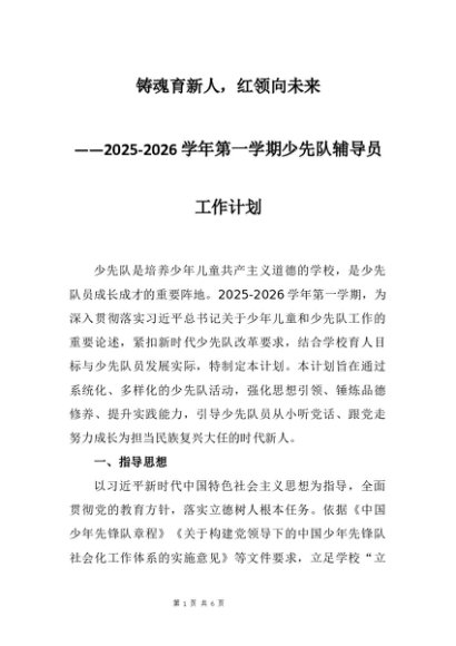 【七哥公文】2025年:2025-2026学年第一学期少先队辅导员工作计划:铸魂育新人,红领向未来+更多免费公文+VX:QiGeGongWen2024