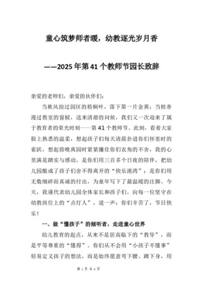 【七哥公文】2025年:2025年第41个教师节园长致辞:童心筑梦师者暖,幼教逐光岁月香+更多免费公文+VX:QiGeGongWen2024