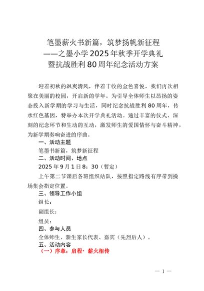 【七哥公文】2025年:1 之墨小学开学典礼暨抗战胜利 80 周年纪念活动方案+更多免费公文+VX:QiGeGongWen2024