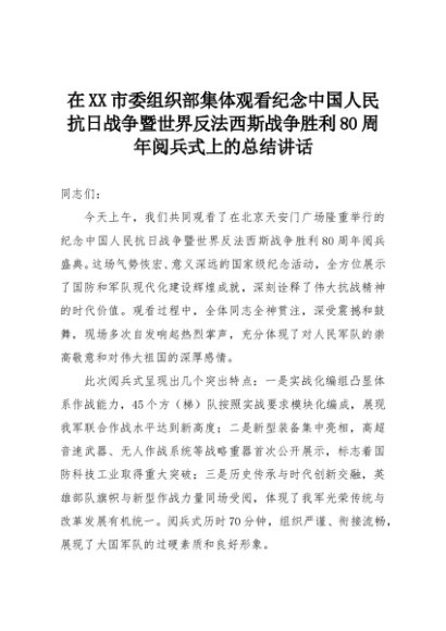 【七哥公文】2025年:在XX市委组织部集体观看纪念中国人民抗日战争暨世界反法西斯战争胜利80周年阅兵式上的总结讲话+更多免费公文+VX:QiGeGongWen2024
