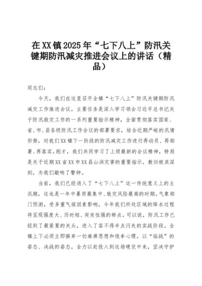 【七哥公文】2025年:在XX镇2025年“七下八上”防汛关键期防汛减灾推进会议上的讲话(精品)+更多免费公文+VX:QiGeGongWen2024
