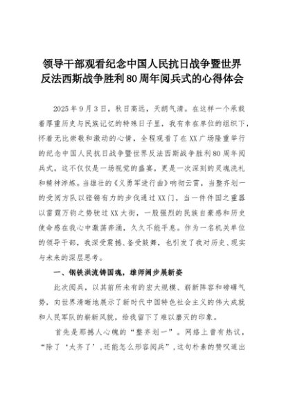 【七哥公文】2025年:领导干部观看纪念中国人民抗日战争暨世界反法西斯战争胜利80周年阅兵式的心得体会+更多免费公文+VX:QiGeGongWen2024