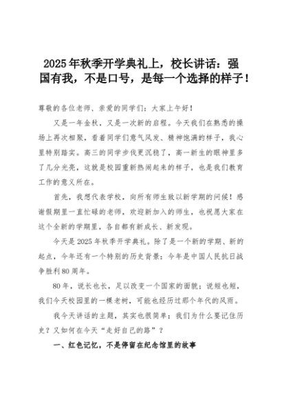 【七哥公文】2025年:2025年秋季开学典礼上,校长讲话:强国有我,不是口号,是每一个选择的样子!+更多免费公文+VX:QiGeGongWen2024