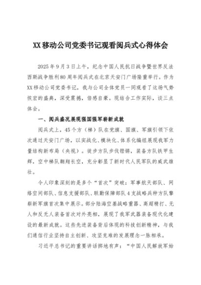 / 【七哥公文】2025年:XX移动公司党委书记观看阅兵式心得体会+更多免费公文+VX:QiGeGongWen2024