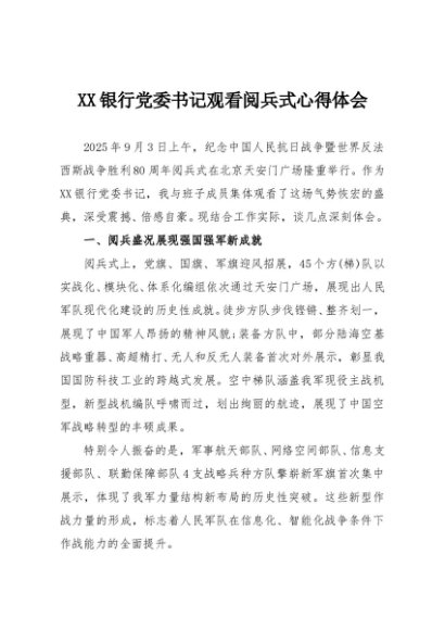 / 【七哥公文】2025年:XX银行党委书记观看阅兵式心得体会+更多免费公文+VX:QiGeGongWen2024